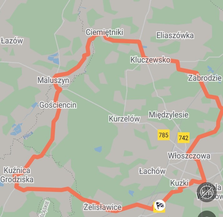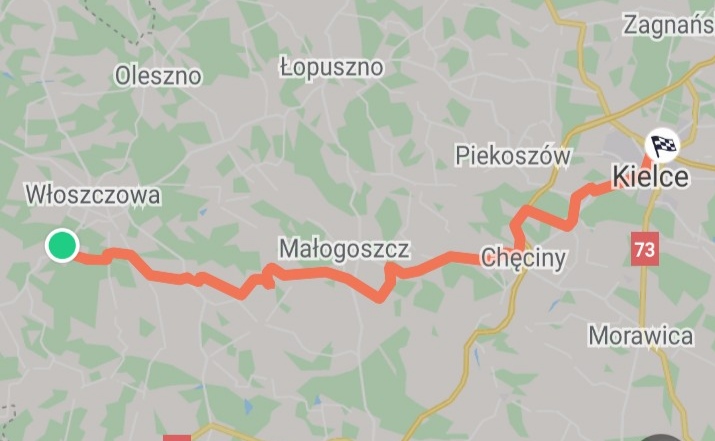 Trasa powrotu 19.09.2021 r.: Czarnca-Kąty-Konieczno-Zalesie-Lasochów-Mieronice-Karsznice-Bocheniec-Szewce-Zalesie-Kielce. Dystans ok. 70 km.