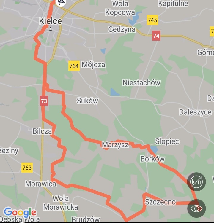 Wycieczka prowadzona przez Andrzeja z cyklu “Bliżej Natury” pod hasłem “Dąb Jędruś zaprasza” Trasa wycieczki: Kielce – Borków – wiata Murawin – Szczecno – Skrzelczyce – Radomice – Marzysz- Dyminy – Kielce. Dystans ok. 70 km, wzięło udział 19 osób. Zachmurzenie z przejaśnieniami temp. ok 20 st., duża wilgotność powietrza z komarami.